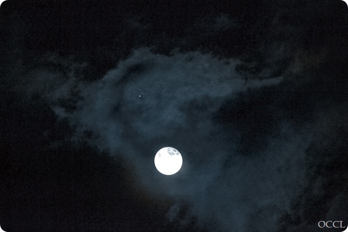 Up above the moon slightly to the left there was a star shining ever so brightly that is Jupiter . Jupiter stands above the Moon on the 1st, rises soon after nightfall, remains out all night, and reaches its maximum brightness of the year by month’s end. The clouds were moving at a fair clip and I didn't want to miss capturing them in the photo .